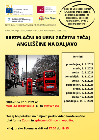 V februarju in marcu 2021 bomo izvedli 60 urni brezplačni začetni tečaj angleščine na daljavo za odrasle. Tečaj je namenjen starejšim od 45 let, zaposlenim ali brezposelnim z največ V. stopnjo izobrazbe (srednješolska izobrazba). Tečaj bo vsakič trajal 3 šolskih ur od 17.00 do 19.15 preko videokonferenčne platforme Zoom. Ostale ure bodo potekale preko spletne učilnice in e-pošte.
