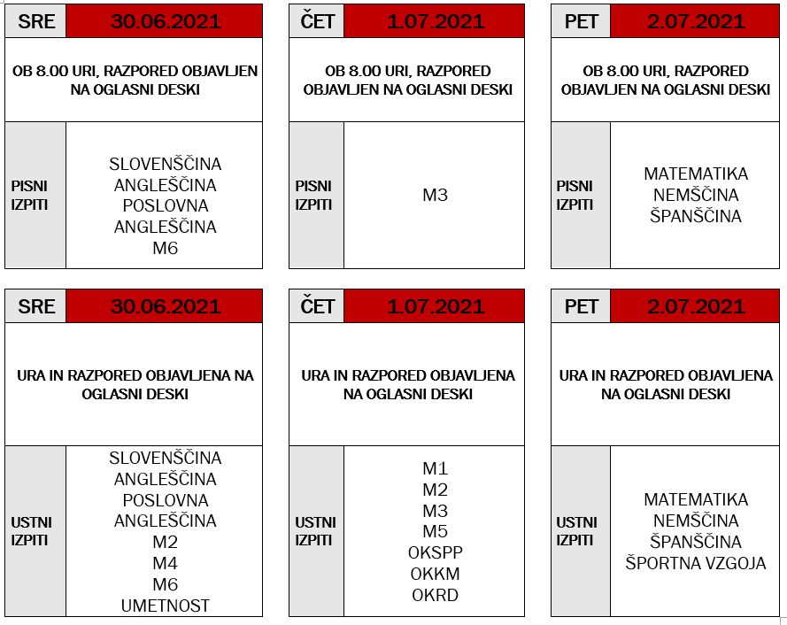 Dopolnilni in popravni izpiti v spomladanskem roku se pričenjajo 30. junija 2021 in trajajo predvidoma do 2. julija 2021.